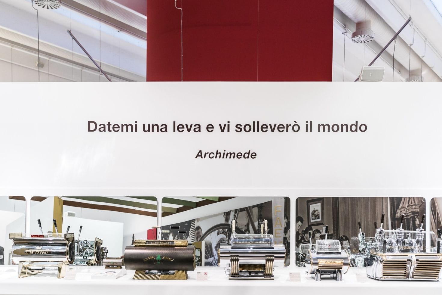 Jetzt dreht euch um. Schaut euch das große Foto auf der braunen Trennwand an: Es zeigt die Arbeiter einer Werkstatt, in der die Figur abgebildet ist, von der aus die Geschichte von Cìmbali ihren Anfang nimmt. Stehend links, mit verschränkten Armen, der junge Giuseppe Cìmbali, ein Pionier unter den Pionieren: Dieses Foto belegt, dass Giuseppe Cìmbali im Jahr 1906 bereits im Sektor tätig war und Maschinen herstellte, die bald darauf der Welt auf der Mailänder Ausstellung präsentiert werden sollten. Von der Lehre bis zur Eröffnung seines Geschäfts im Jahr 1912 vergingen einige Jahre und weitere für die Produktion seiner ersten Kaffeemaschine in den frühen 1930er Jahren. Aber schon zu Beginn war er da. Auf dem zentralen Foto an der Trennwand in der Mitte links könnt ihr hingegen das Foto des Bezzera-Stands sehen und im Detail Herrn Luigi neben einem Schild entdecken, das die Zusammenarbeit mit Pavoni besiegelt.