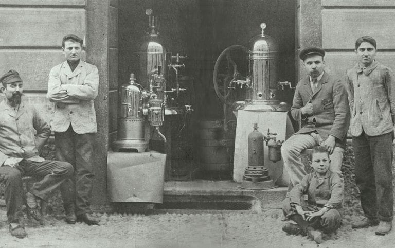 Links sehen Sie das erste Stück, auf das Sie sich konzentrieren sollten: die Erfindung des Turiners Angelo Moriondo aus dem Jahr 1884. Obwohl sie noch weit von der Entwicklung der ersten Espressomaschinen entfernt ist, verdient sie Anerkennung dafür, dass sie erstmals Dampf zur Extraktion des Getränks verwendet und den immer zahlreicher werdenden Liebhabern eine qualitativ hochwertige Getränkeoption bietet. Der Kaffee ist jedoch noch nicht "Espresso", dh nicht "Tasse für Tasse" ausgegeben, sondern "instant", da er immer noch in größeren Mengen zubereitet wird. Zwei dieser patentierten, aber nie vermarkteten Maschinen waren im Gran Caffè Ligure der Familie Moriondo für den öffentlichen "instant" Kaffeeservice zu bewundern, wie es von Moriondo selbst definiert wurde. Aber was bedeutet dann eigentlich Espresso? Und wann entsteht er? Um dies zu verstehen, schauen Sie auf die Ideale-Maschine auf Ihrer rechten Seite. Im Jahr 1901 erfand der Mailänder Luigi Bezzera die in dieser Maschine vorhandene einzelne Ausgabegruppe. Beachten Sie den Siebträger mit einem oder mehreren Ausgießern und das Befestigungssystem am zentralen Körper der Maschine: Sie ähnelten bereits sehr denen von heute, nicht wahr? Die Ausgabegruppe, die den Kaffee "Tasse für Tasse" produziert, kennzeichnet tatsächlich die Entstehung des Espressos, also des Kaffees, der speziell und schnell, auf ausdrücklichen Kundenwunsch, zubereitet wird. Aber dieser Kaffee, obwohl "espresso", war sehr unterschiedlich von dem, an den wir heute gewöhnt sind: Er wurde mit Dampf hergestellt, daher eher verbrannt, kochend heiß und schwarz ohne Crema, ein Merkmal, das erst über 4 Jahrzehnte später eintreffen wird. Desiderio Pavoni erwirkt die Nutzung des Patents und wendet die Erfindung auf die Ideale-Maschine an. Die Maschine wird erstmals auf der Mailänder Internationalen Ausstellung von 1906 am Stand von Luigi Bezzera präsentiert, und von diesem Moment an hebt die Branche ab.